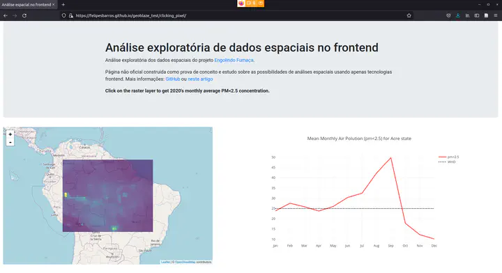 Em ambas implementações os valores dos pixels são extraídos just-in-time e o gráfico em plotly é atualizado representando o comportamento temporal dos mesmos. Tais dados se referem a Material Particulado < 2.5 do ano de 2020. No gráfico, apresentamos, ainda, o valor máximo sugerido pela Organização Mundial da Saúde (World Health Organization - WHO).