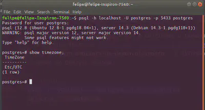Ao executar a consulta select now(), ele me dá a data e hora com a info de time zone utc (+00):